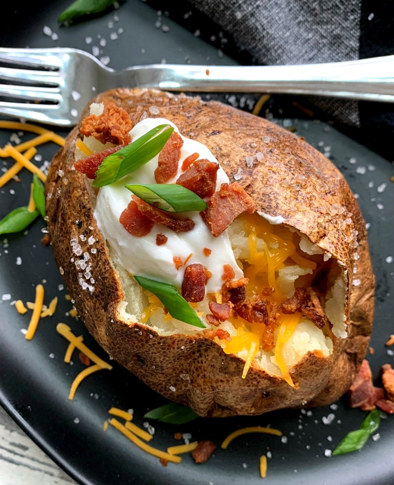 Air Fried Baked Potatoes – perfect crispy skin with fluffy soft potato inside. Steakhouse style baked potato cooked in the air fryer!