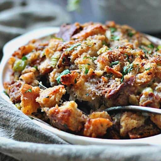 Old Fashioned Bread Sausage Stuffing – easy old fashioned stuffing from scratch. This is my family’s #1 Thanksgiving side dish – bakes outside the bird.