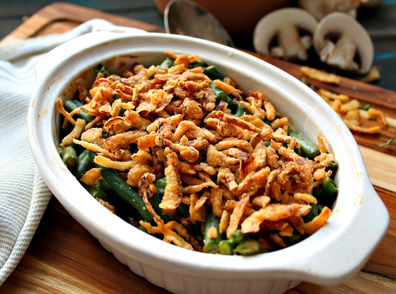 Green Bean Casserole – NO canned soup – fresh green beans cooked to tender-crisp with homemade creamy mushroom sauce topped with French’s crispy fried onions.