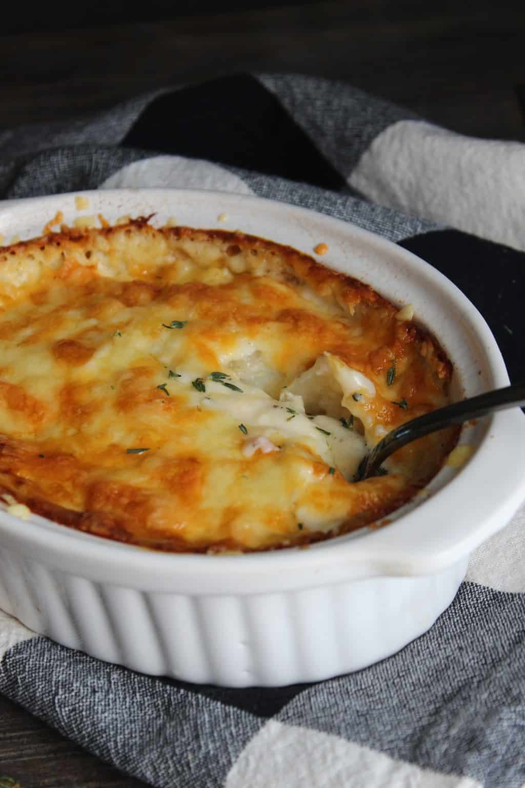 Au Gratin Potatoes: Tender sliced potatoes blanketed in layers of creamy, white Cheddar-Smoked Gouda cheese sauce with a golden, slightly crisp top.
