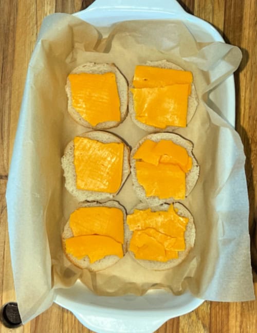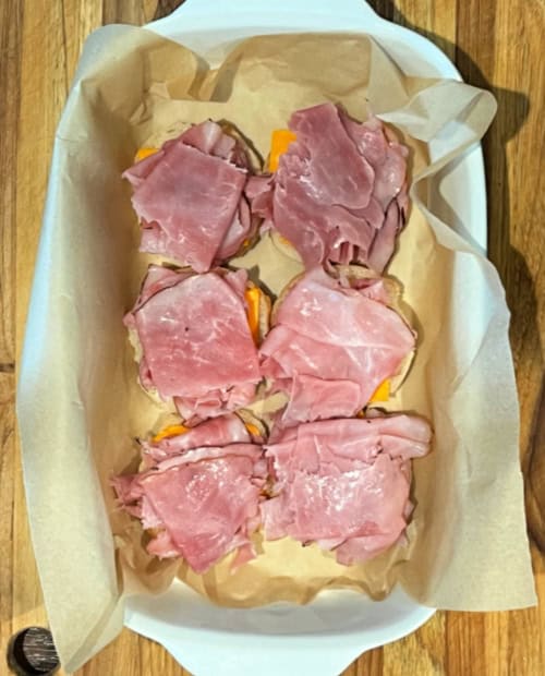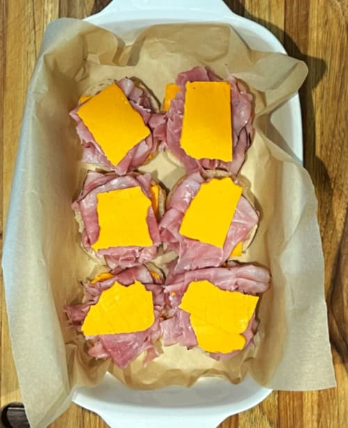 - Place the bottom half of the rolls into the prepared baking dish. Layer half of the cheddar cheese, trimming as needed to fully cover the rolls. Add the ham evenly over the cheese. Top with another layer of cheese slices. Place the top buns over the cheese layer.