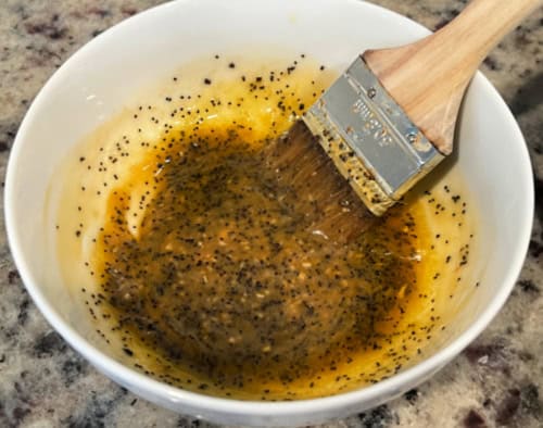 - Make the butter sauce: In a small microwave-safe bowl, melt the butter. Whisk in Dijon, Worcestershire, hot honey, poppy seeds and dried minced onion. Set aside.