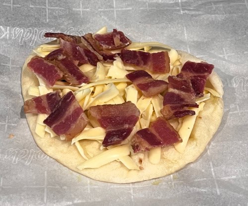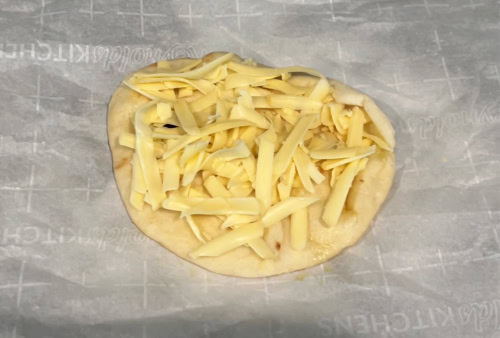 - Sprinkle shredded cheese over the top of the naan then add cooked bacon around the edges.