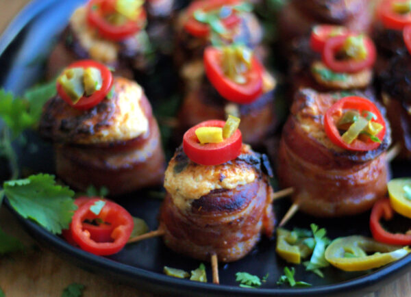 Crispy bacon cups with sliced smoked sausage, melty cheese, jalapenos and bbq seasoning. A meat lover’s dream!