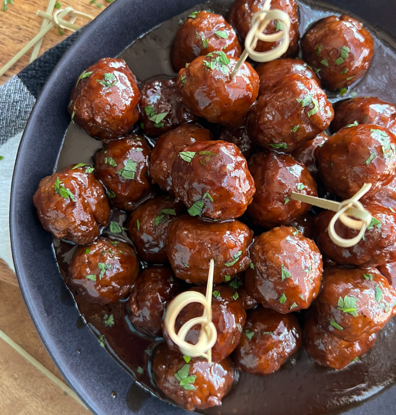 Crockpot Grape Jelly-BBQ Meatballs – a super easy appetizer with just 3 ingredients and 5 minute prep – juicy meatballs blanketed in a sweet and spicy sauce.
