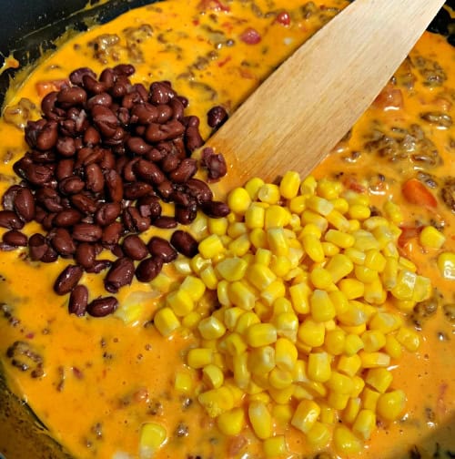 Drain any excess grease then lower the heat to medium low and add Rotel tomatoes, both cheeses and milk stirring to completely blend. Note: it helps to break up the Velveeta before adding it to the skillet.
