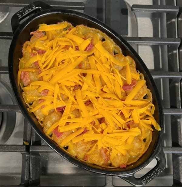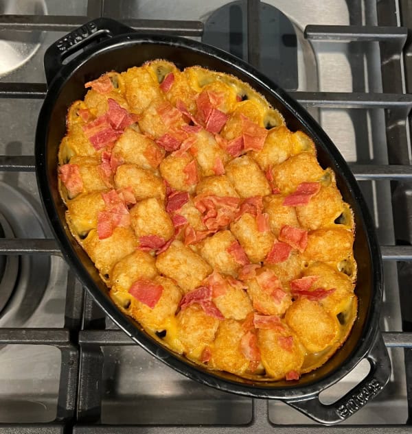 - Bake uncovered 40-45 minutes until golden and the tots are crispy.