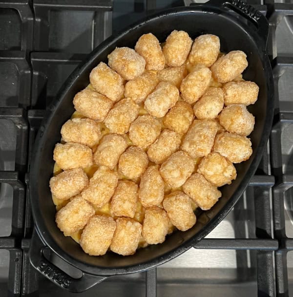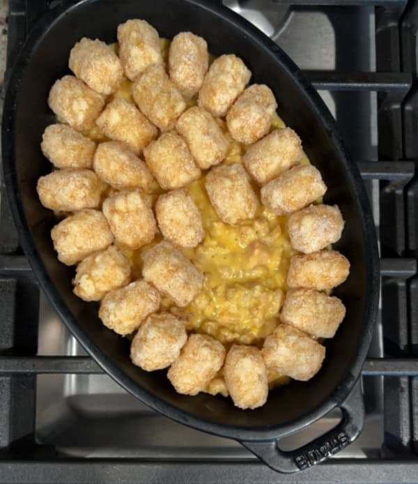- Transfer the meat mixture to the prepared casserole dish and top with tater tots in a single layer completely covering the chicken mixture.