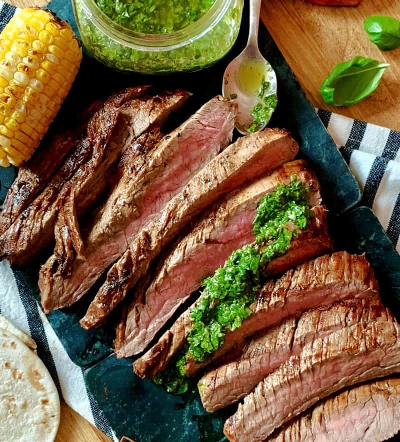 Chimichurri Steak – marinated flank steak grilled to tender, juicy perfection drizzled homemade basil chimichurri for an easy, Argentinian meal.