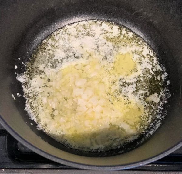- Melt butter in a medium saucepan or Dutch oven. Add finely diced onion then cook 2-3 minutes or until onions have softened (not browned).