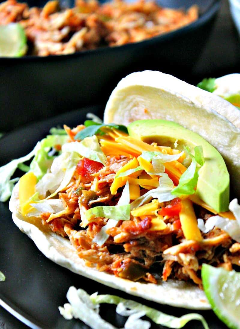 Cover and cook on high 3-4 hours; low 5-7 hours until chicken is fork-tender but before it’s mushy.