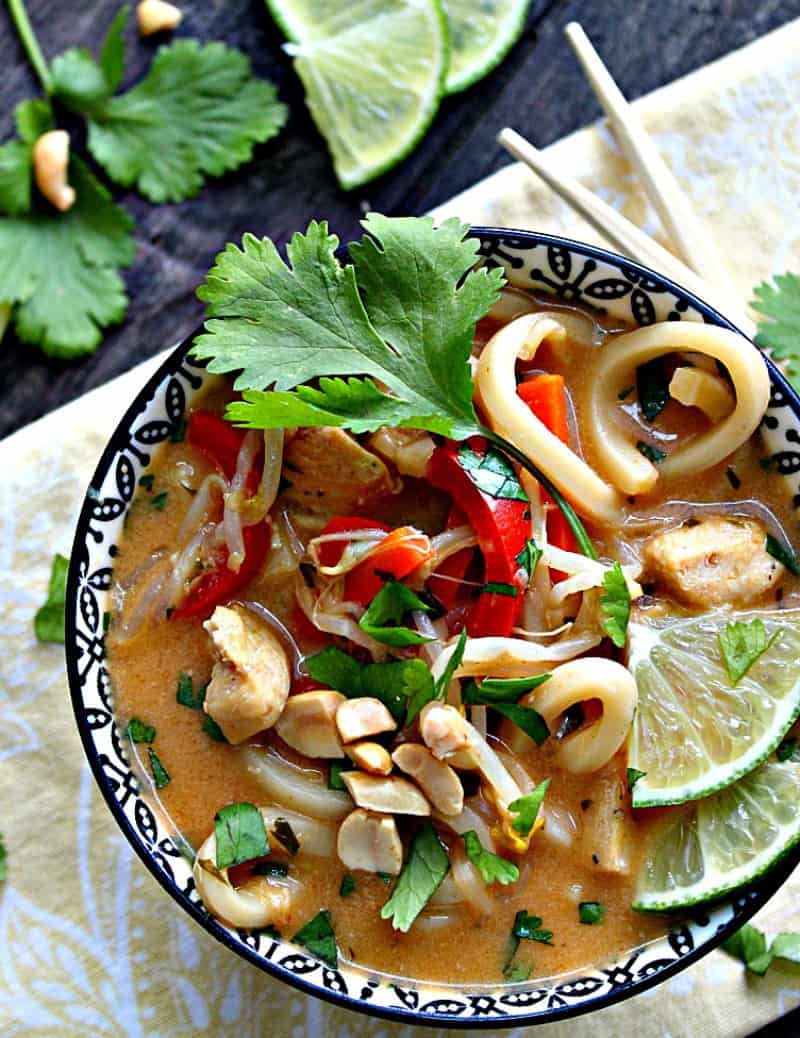 To serve, garnish with slivered green onions, chopped peanuts and lime wedges for an extra squeeze of lime juice.
