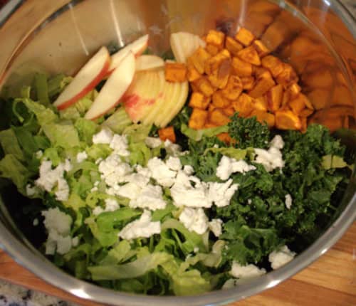 - Add the romaine lettuce, apple slices, sweet potato cubes and goat cheese (optional: reserve some of the apple slices for garnish). Drizzle with the remaining dressing, toss to combine well.