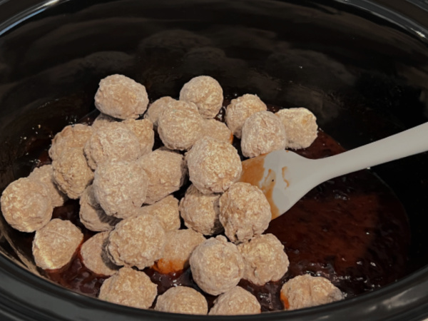 Add the BBQ sauce and grape jelly to the slow cooker. Whisk or stir to blend then add the frozen meatballs to the sauce, turning to coat them.
