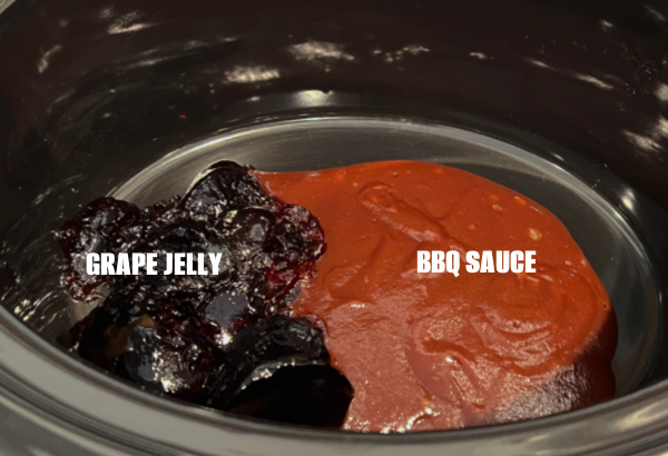 - Add the bbq sauce and grape jelly to the slow cooker. Whisk or stir to blend.