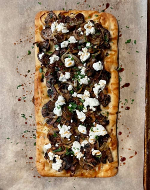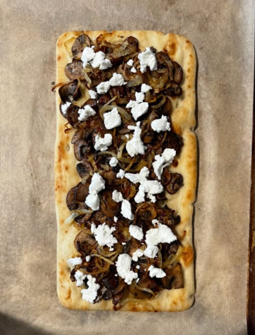- Spread sauteed mushrooms and onions over the flatbead. Top with small dollops of goat cheese. Bake 6-7 minutes or until the cheese is softened and very light golden (optional: broil 1-2 minutes).