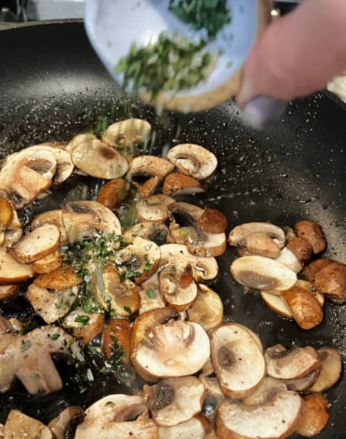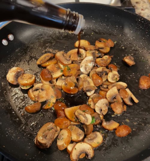 - Add mushrooms to the same skillet over medium heat. Season lightly with salt and black pepper. Cook 5-7 minute or until golden. Splash in 1 tablespoon of worcestershire sauce, stir and cook 1 more minute.