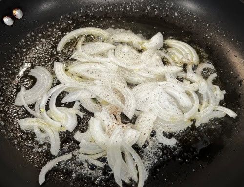 Slice mushrooms. Peel and thinly slice the onion. Add olive oil and butter (if you don’t have butter, use all olive oil) to a large skillet over medium-high heat. Transfer onions to skillet. Season with salt and black pepper. Cook 4-5 minutes or until light golden.