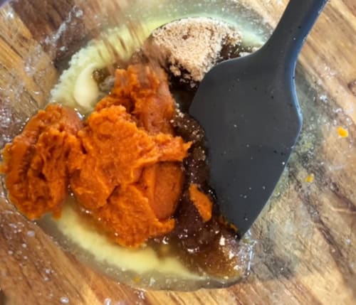 To the melted butter, add brown sugar, pumpkin puree and 1/2 teaspoon of pumpkin spice. Stir by hand until smooth.