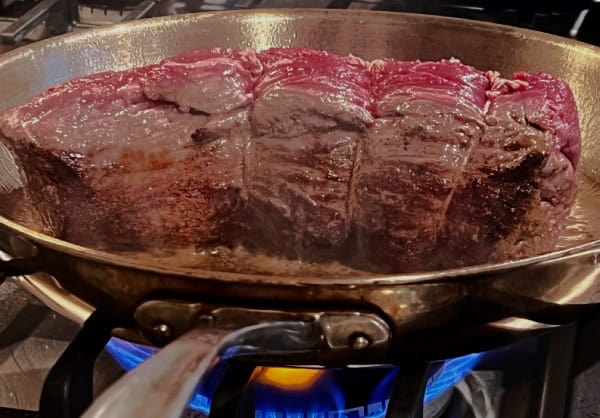 The beef is pan seared creating a delicious caramelized crust on the outside then oven roasted for the perfect temp inside and melt-in-your-mouth tender.