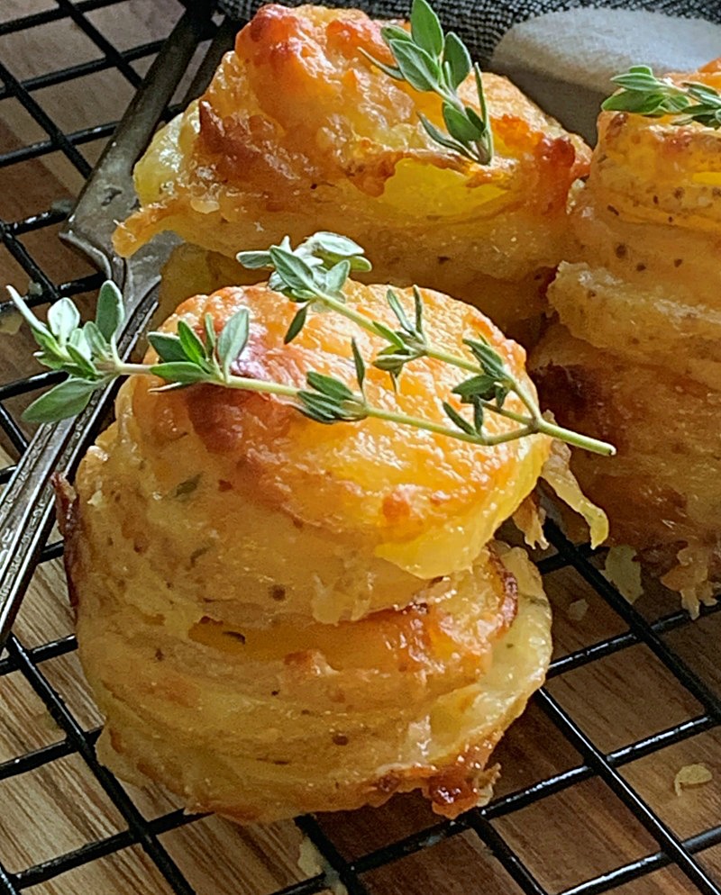 Muffin Tin Potato Stacks – buttery, cheesy thinly sliced stacked potatoes with crispy, golden edges baked in a muffin tin.