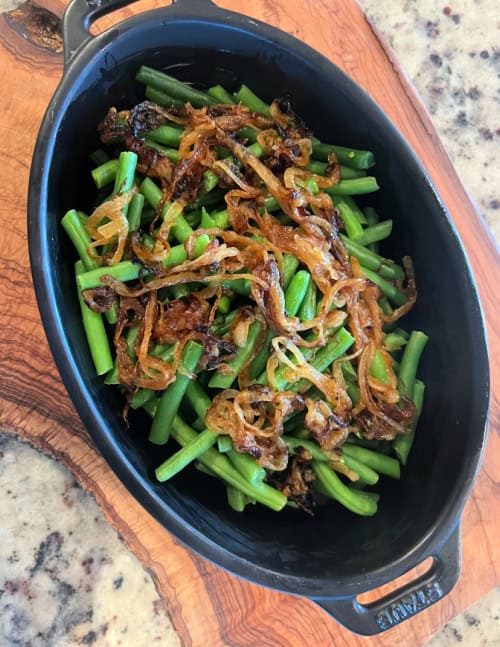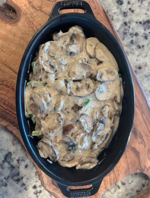 Add half of the caramelized onions to the top of the green beans then pour the mushroom sauce over it. Sprinkle the remaining onions over the sauce and bake 350° 12-15 minutes (uncovered) or until hot, bubbly and the onions are crisp.