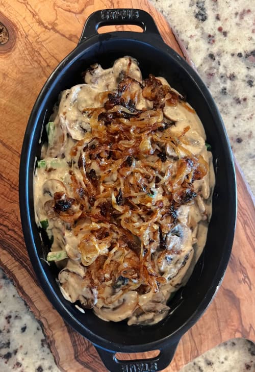 - This casserole can be prepped ahead of time and baked just before serving. Add mushroom sauce and remaining caramelized onions then cover and refrigerate. Remove from the fridge about 30 minutes before baking. Transfer to the oven and bake until hot, bubbly and the onions are crispy