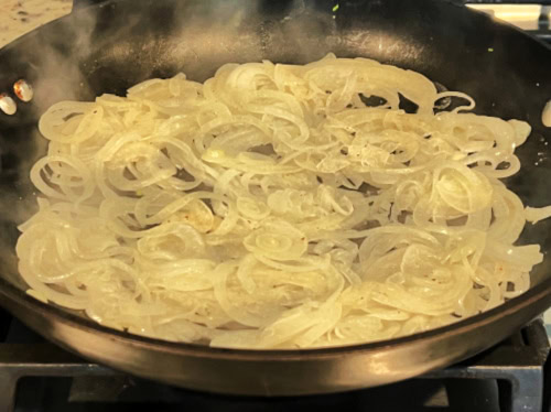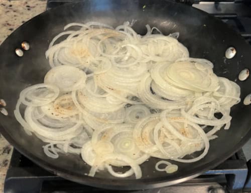 To the same skillet, drop in sliced onions. Season with salt and black pepper. Add 1/4 cup of water. Cover and cook on high steaming the onions until water is evaporated.