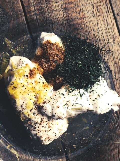 - Season with fresh dill, Old Bay, Tabasco and fresh cracked black pepper.