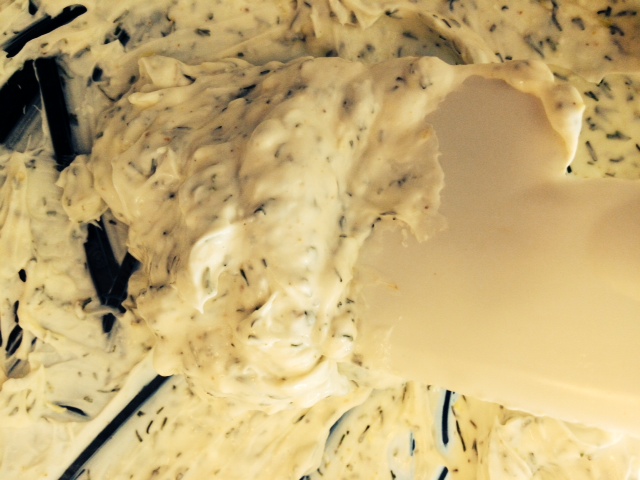 Measure the ingredients into a medium size bowl. Schmeeear (that’s a technical culinary term – ha!) it together using a fork or spatula. Mmmmm — inhale the dill! Oh — this is important. You may think I forgot salt in the recipe — something I love almost as much as the french fries I put it on (I know, I know, a Cardinal sin!) — anyway, I did not forget salt. Smoked salmon is a bit salty anyway and the Old Bay in the recipe contains salt, so mix it up, taste it and see — and only add salt if you need some at that point.