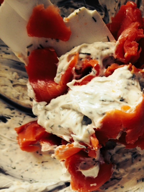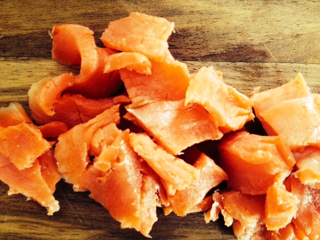 Lovely, smoky salmon – already smoked for you. Rough chop it on the cutting board and add it to the rest of the creamy goodness. Swirl it around, blending and breaking the salmon up a bit more.