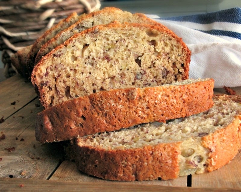 Pour the bread batter into the prepared pan and bake in a 350 degree oven for about 45 minutes or until it’s golden and a toothpick inserted in the center comes out clean.