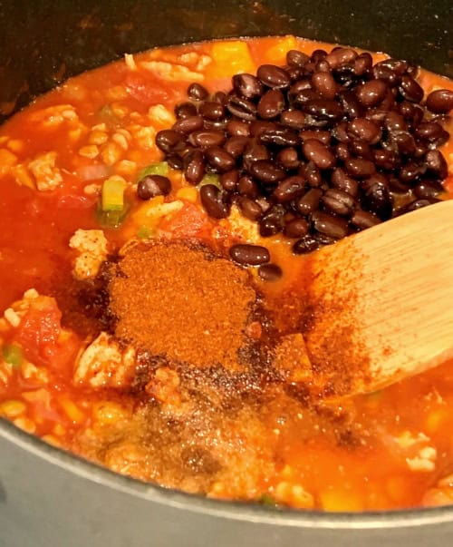 • Add the onion, bell pepper, jalapeno, celery and garlic and continue cooking 3-4 minutes or until the vegetables are tender breaking up the turkey with a spoon or spatula.
