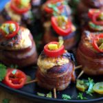 Slice sausage into 20 1″ pieces. Cut bacon strips in half and and set both aside.
