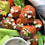 Air Fryer or oven baked spicy Buffalo Chicken Meatballs from ground chicken.