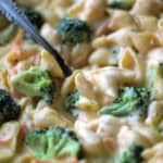 Add cubed cream cheese stirring until it’s almost combined then pour in the chicken stock and give it all a good stir to combine.